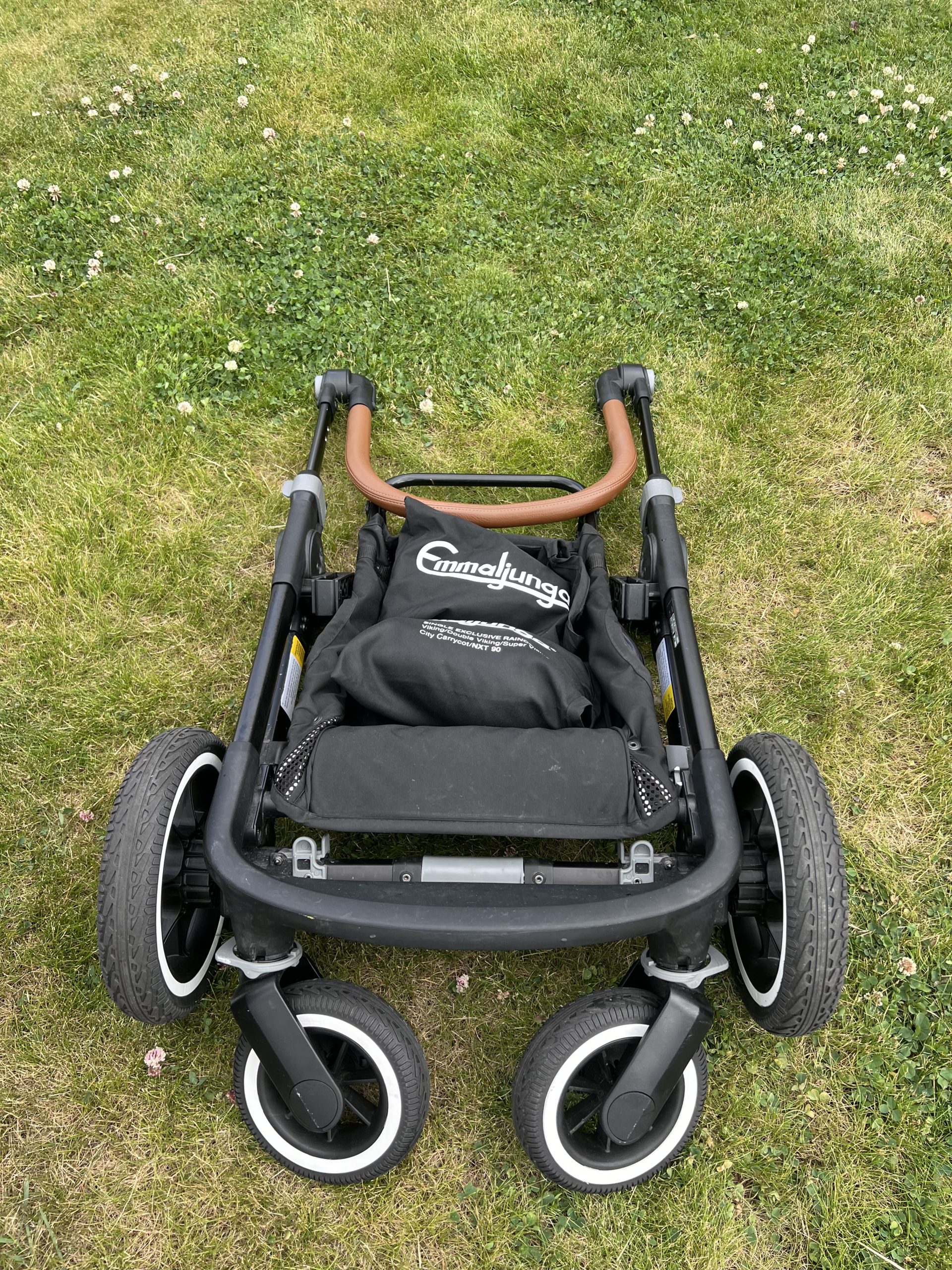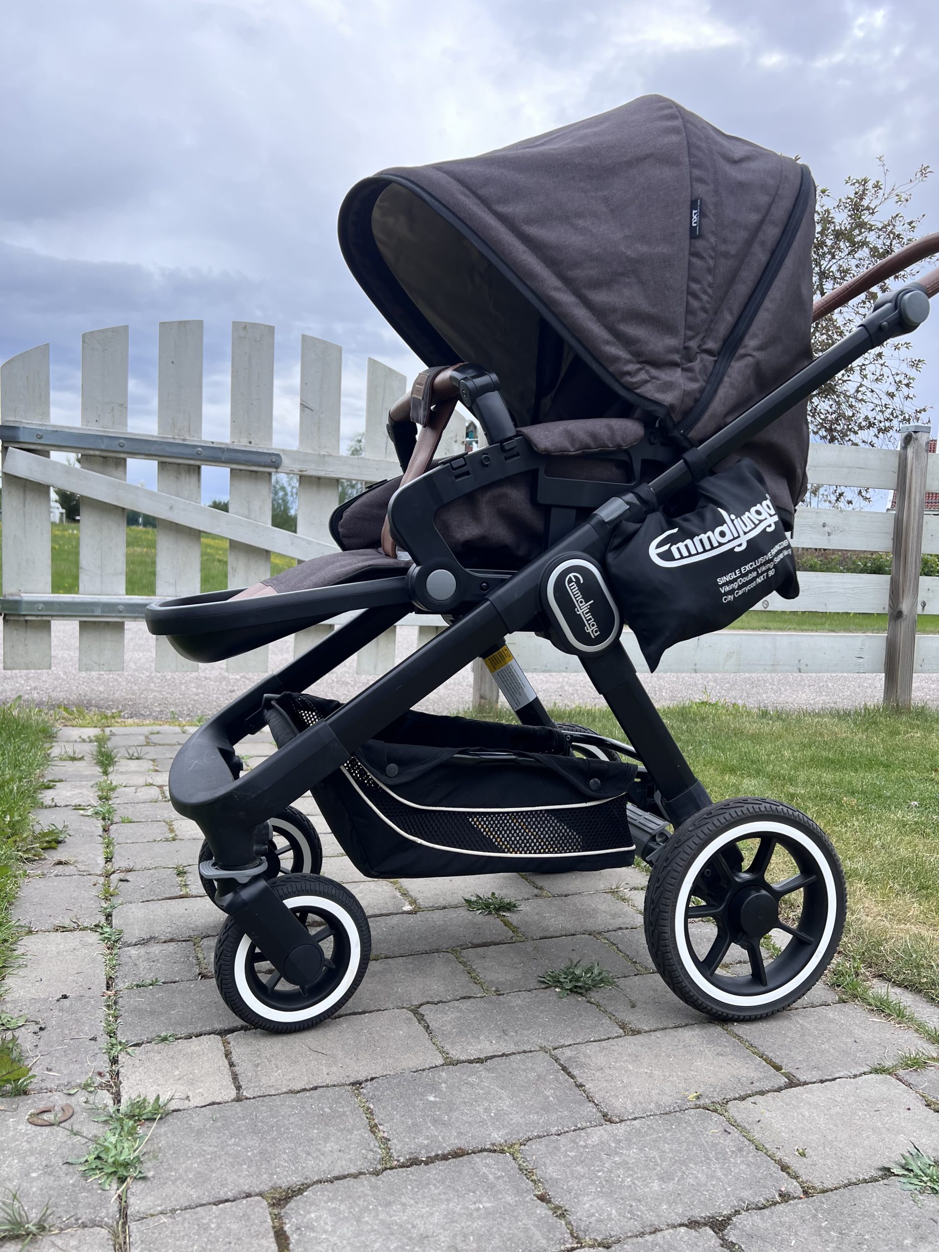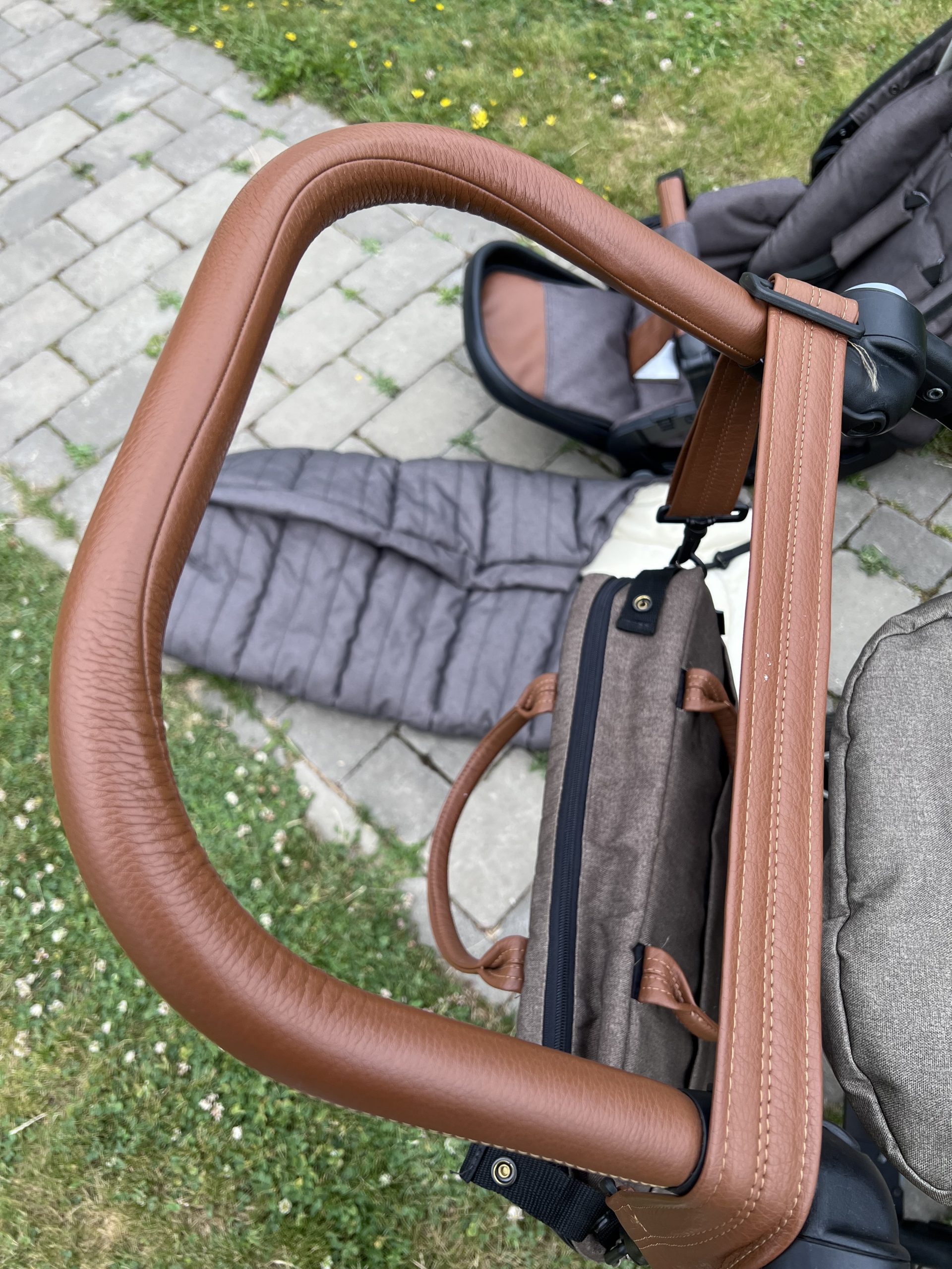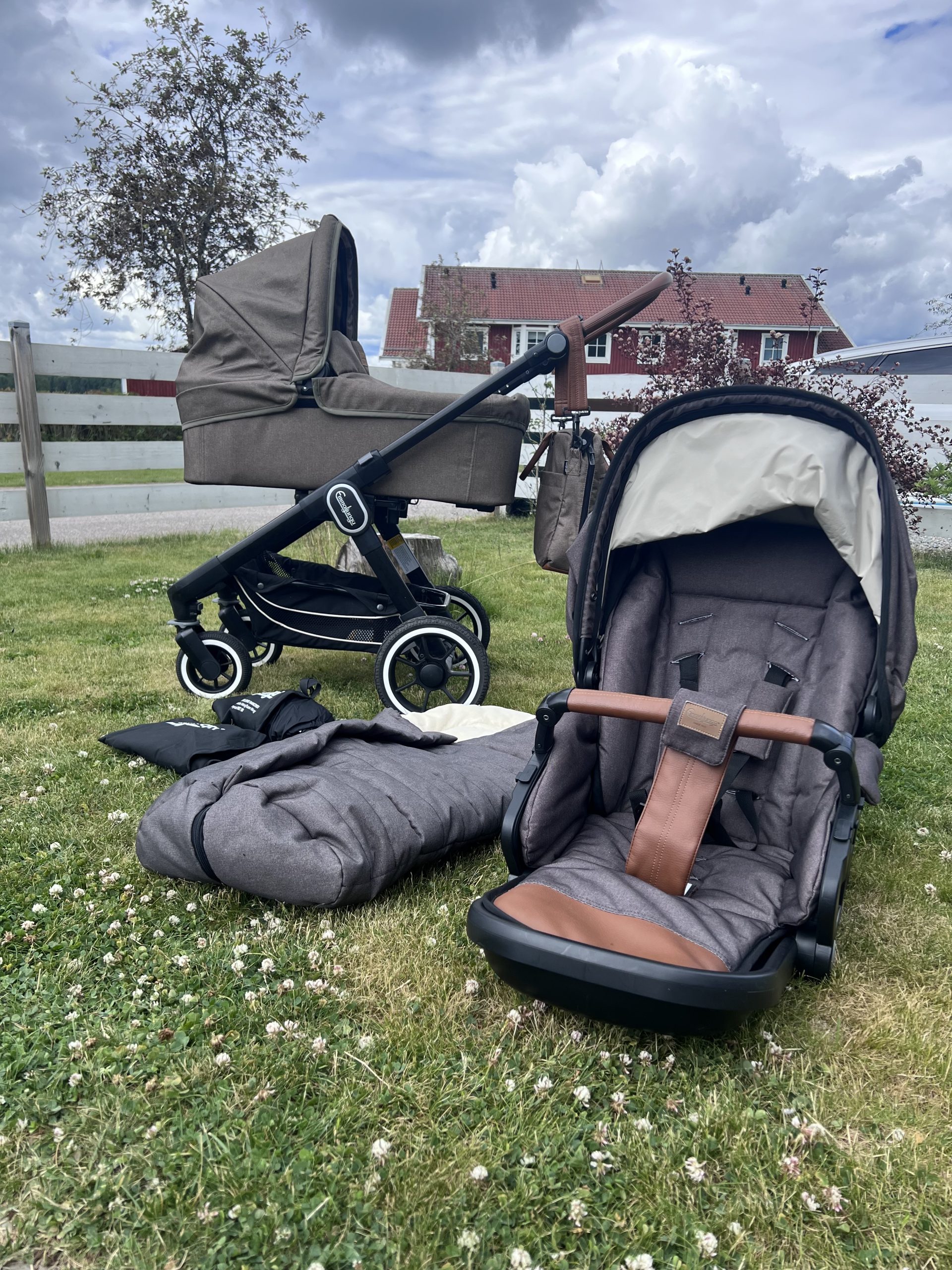 Sittdelen är i en grå/brun färg med matchande åkpåse.